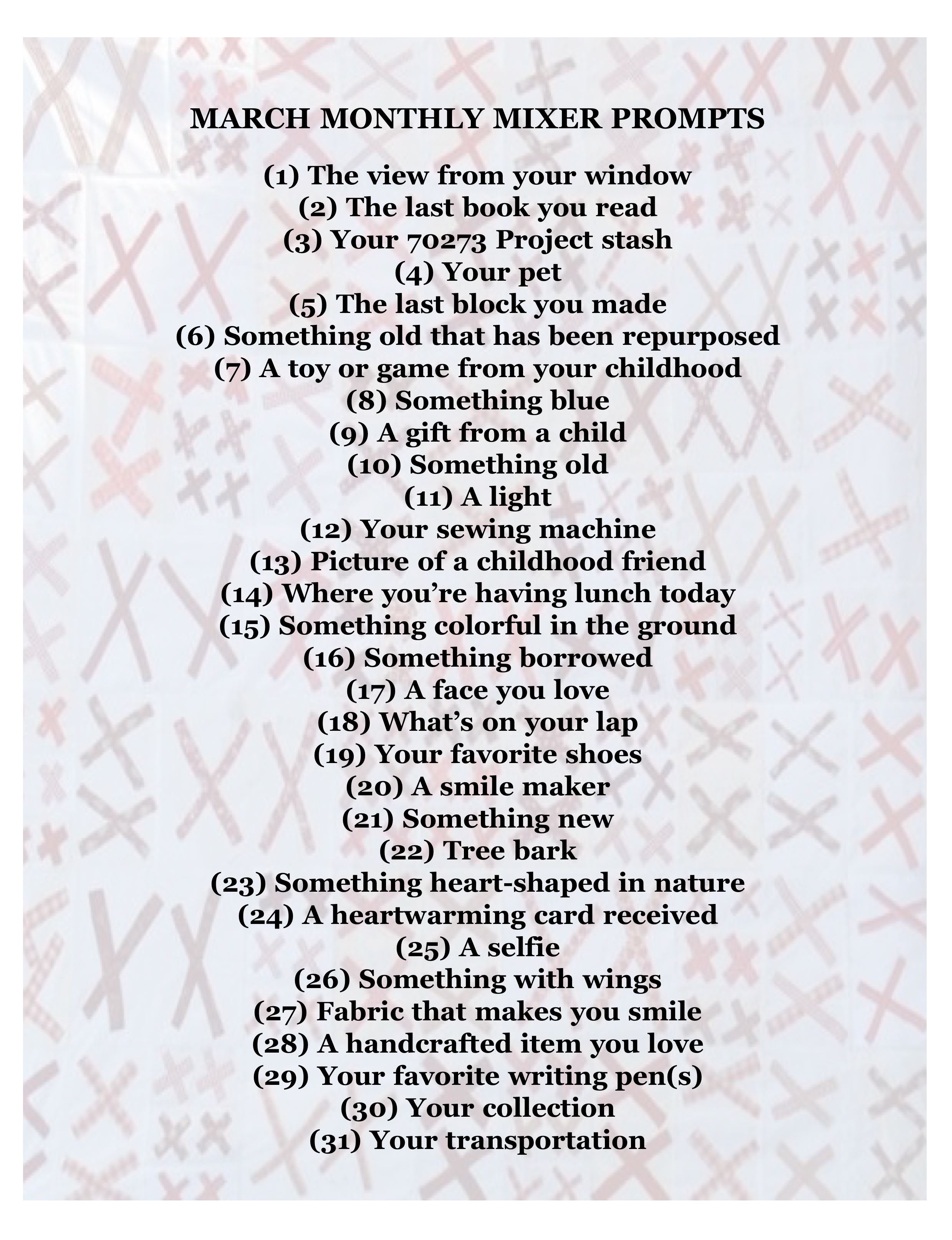 Here are your prompts for February, and we have the creative one known as Pam Yates to thank for most of them! Feel free to share throughout social media land and post on Instagram, Twitter, Facebook, and your blogs using #The70273ProjectMonthlyMixer and #The70273Project. It’d be muchly appreciated if you’d tag me, too, so I don’t miss it. I’m @whollyjeanne on twitter and instagram, and Jeanne Hewell-Chambers on facebook. It’s a fun way to acquaint others with The 70273 Project, and to get acquainted with other folks ourselves. I can’t wait to see the world through your eyes.