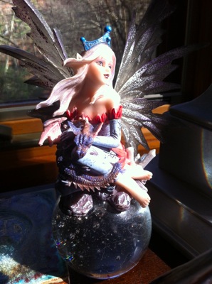 There’s this fairy cuddling a dragon whilst sitting atop a glass ball. My daughter and I saw these in a convenience store when we stopped for fuel on a trip to Hilton Head several years ago. Oh my goodness, how we laughed.