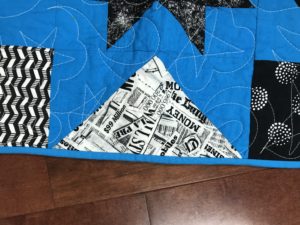 and newspaper for journalist self. I see a theme in Bethany’s quilts: black and what and read all over. Or for those of you who don’t remember that childhood riddle, journalistic communication. It’s part of Bethany’s life, and it’s part of her quilty signature.