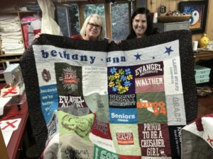 Jeanne and Bethany with her first quilt. She had to borrow a sewing machine and rotary cutter. We’re talking total novice, y’all.